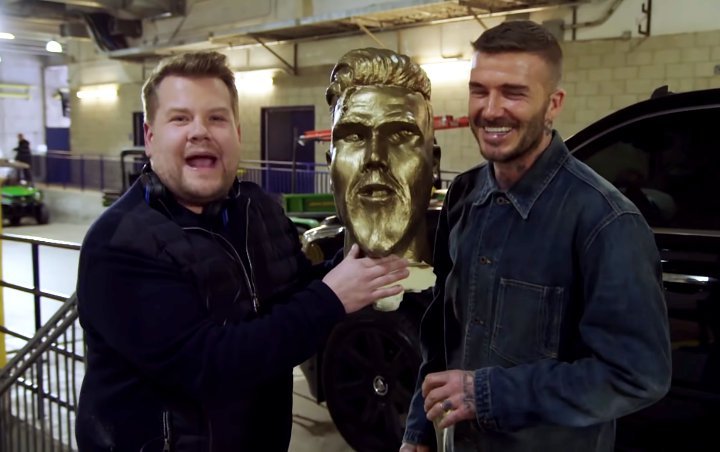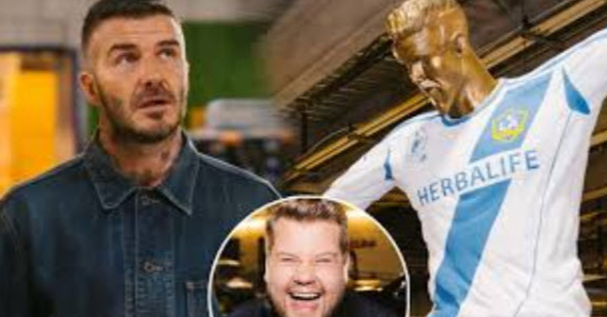 James Corden Pranks David Beckham With Hideous Statue Of Himself Watch Here David Beckham James Corden Just Jared