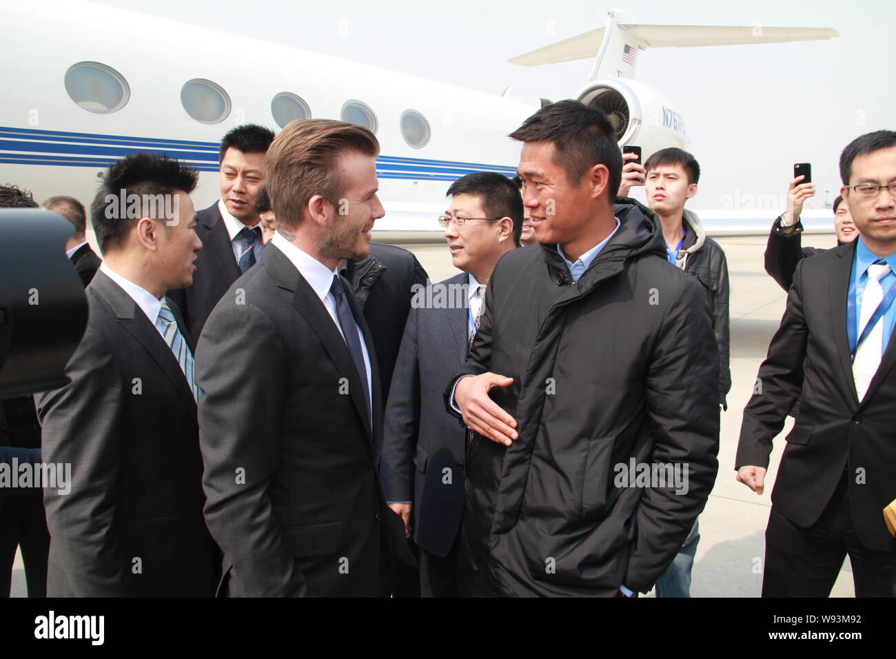 English Soccer Superstar David Beckham Back Second Left Shakes Hands With A Chinese Official After He Deplaned From A Private Jet At The Qingdao Liu Stock Photo Alamy
