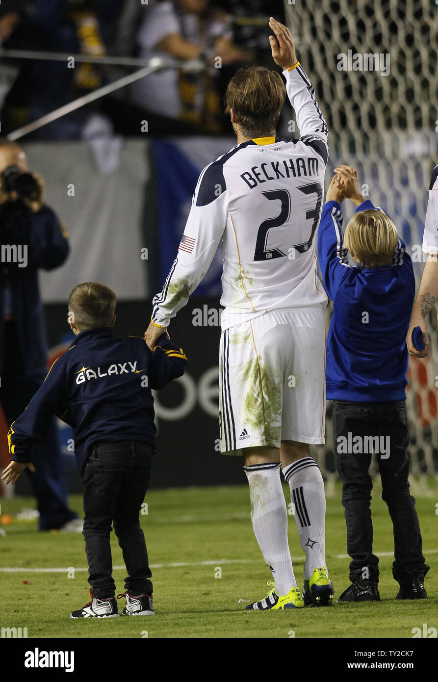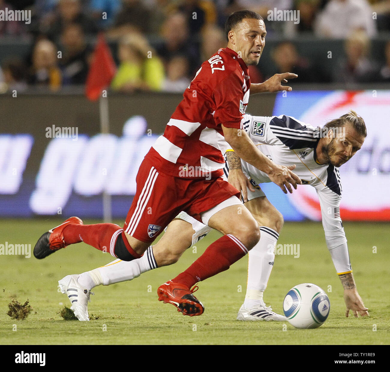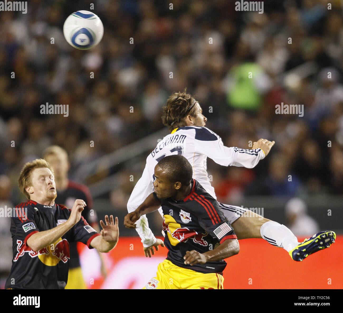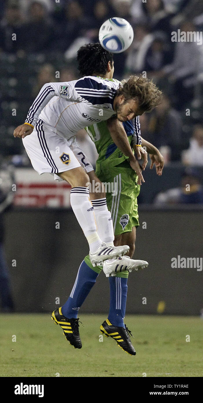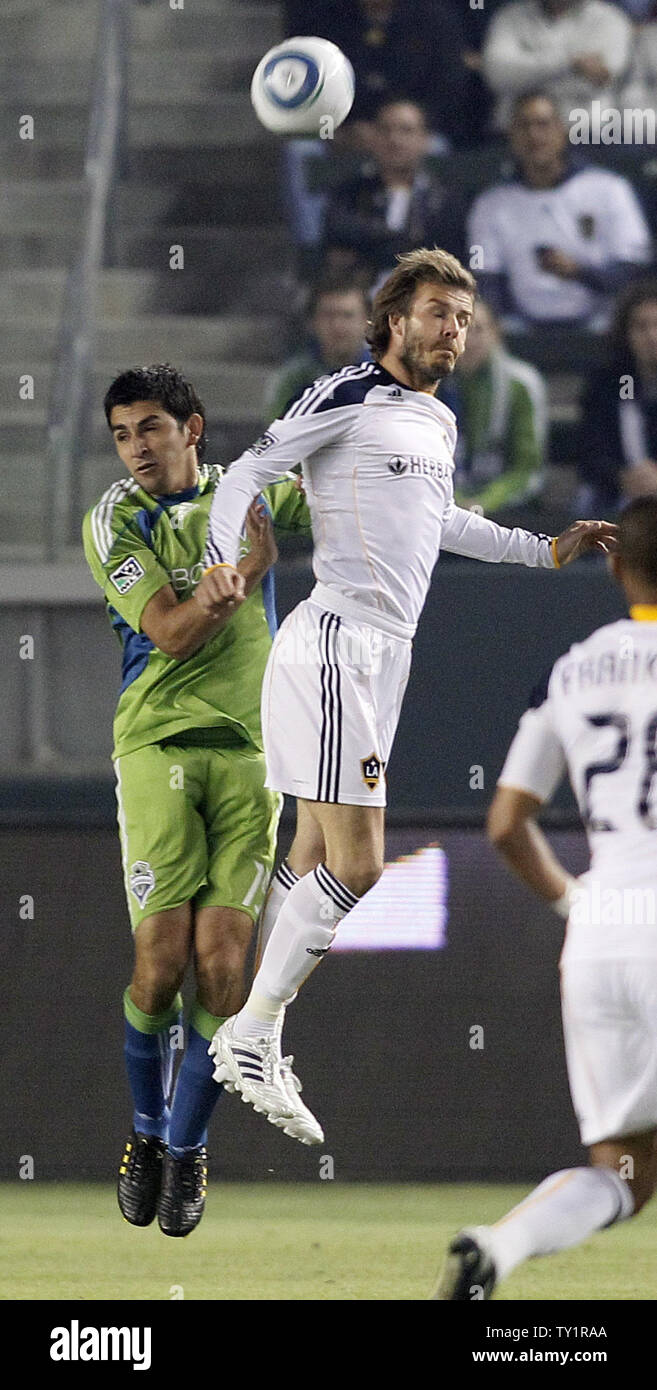 Los Angeles Galaxy Midfielder David Beckham Left And Seattle Sounders Fc Defender Leo Gonzalez Go Up For A Header In The Western Conference Semifinal Playoff Game At The Home Depot Center In Carson